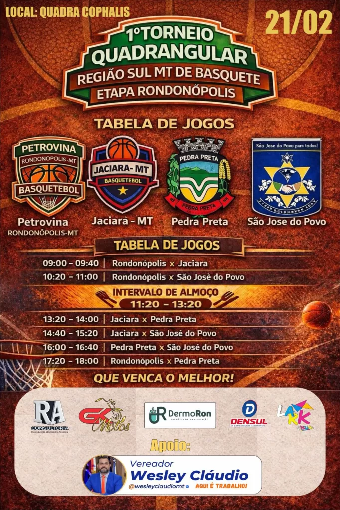 1º Torneio Quadrangular Regional de Basquete da Região Sul de Mato Grosso. O evento, sediado na quadra da Cophalis, reuniu quatro equipes
