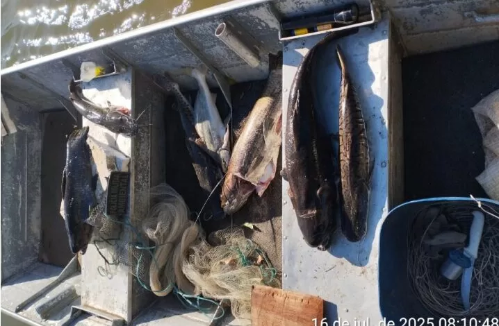 As equipes localizaram um saco branco contendo sete peixes das espécies cachara, barbado e trairão, totalizando 25 kg de pescado. Além disso, os policiais encontraram uma arma de fogo, um tarrafão utilizado para a prática ilegal da pesca e outros petrechos.