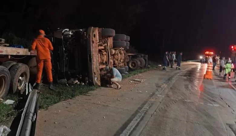 No local, foi constatada uma colisão envolvendo duas carretas, um caminhão-guincho e um veículo de passeio. Apenas no carro havia duas pessoas presas às ferragens: uma senhora de 71 anos e um jovem de 17 anos.