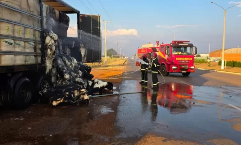 Corpo de Bombeiros combate incêndio em fardos de algodão transportados por carreta