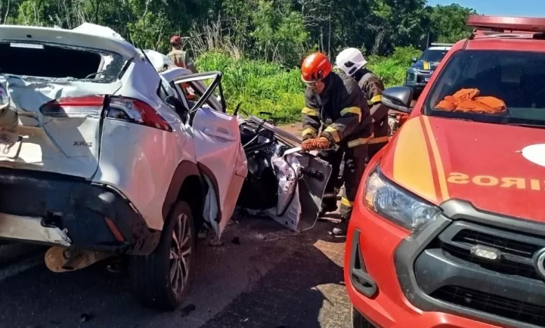 Corpo de Bombeiros realiza desencarceramento do corpo de duas vítimas que ficaram presas em ferragens após acidente na BR-070