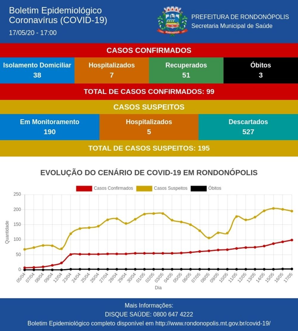 No entanto, há 195 casos suspeitos em Rondonópolis que aguardam resultados dos exames; deste total cinco estão hospitalizados. No sábado eram 201 suspeitos com quatro casos hospitalizados. No boletim informativo da prefeitura há informação é 527 casos foram descartados em Rondonópolis.