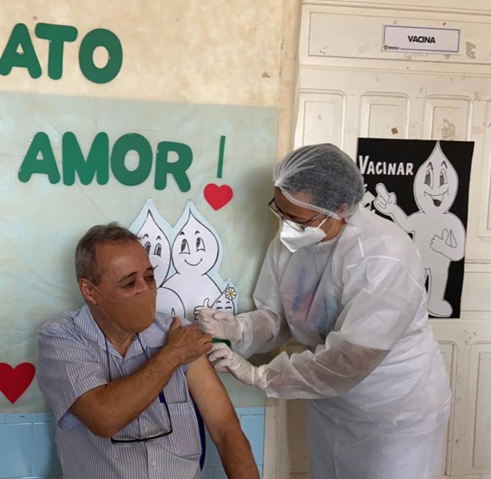 O médico Dr. Antônio Dourado (75) foi o primeiro a ser vacinado pela técnica de enfermagem, Joanice Vieira de Souza (53), a segunda pessoa imunizada contra covid-19 foi a idosa institucionalizada (moradora do asilo Casa Gaetana), Maria Graças Firmino (63), a Fia. O ato simbólico foi realizado nesta sexta-feira (22), na unidade Programa Saúde da Família – PSF 1. A cerimônia contou com a presença do prefeito municipal Waldeci Barga Rosa (DEM), da vice-prefeita Fátima Martini (DEM), da secretária Municipal de Saúde Nany Nascimento. Já a idosa foi vacinada na sede do asilo. Esta é apenas a primeira etapa do processo de imunização.