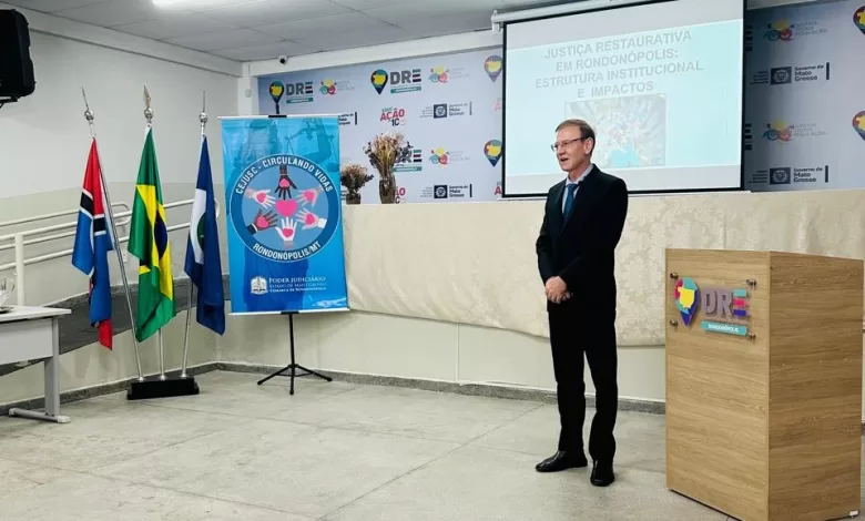 Durante o evento conduzido pelo juiz Wanderlei José dos Reis, coordenador do CEJUSC, titular da 2ª Vara de Família e Sucessões e diretor substituto do foro de Rondonópolis e coordenador suplente do NUPEMEC/MT, foi apresentada detalhadamente a estrutura do programa de Justiça Restaurativa, em âmbito estadual e local, bem como as normativas vigentes que dão amparo legal e institucional à sua aplicação no âmbito da Secretaria de Estado de Educação (SEDUC) e os benefícios da aos alunos, profissionais da educação e familiares da aplicação da metodologia no ambiente escolar.