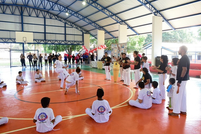 Os alunos do projeto de capoeira fizeram uma apresentação e mostraram o que já aprenderam no pouco tempo que as aulas começaram na unidade. Eles receberam das mãos da secretária de Educação, Carmem Garcia Monteiro e do prefeito Zé Carlos do Pátio os uniformes do projeto Arte e Educação e também alguns instrumentos que são utilizados nas rodas de capoeira.
