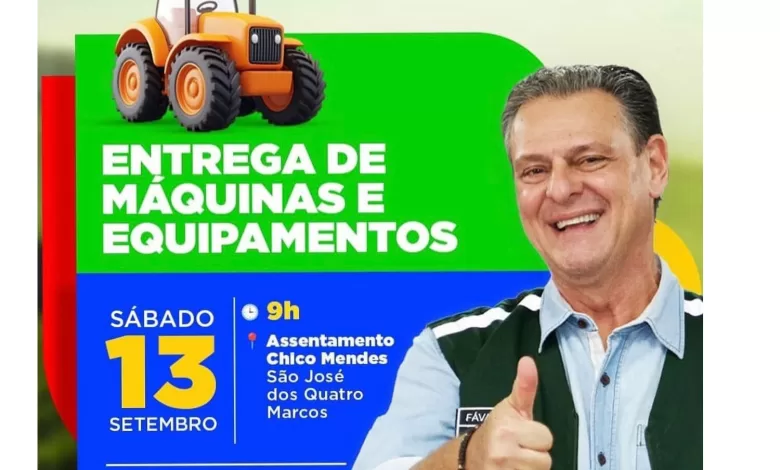 O ministro da Agricultura e Pecuária, Carlos Fávaro, estará no município de São José dos Quatro Marcos, neste sábado (13), para realizar a entrega oficial de um conjunto de máquinas e equipamentos agrícolas destinados a pequenos produtores rurais da região.