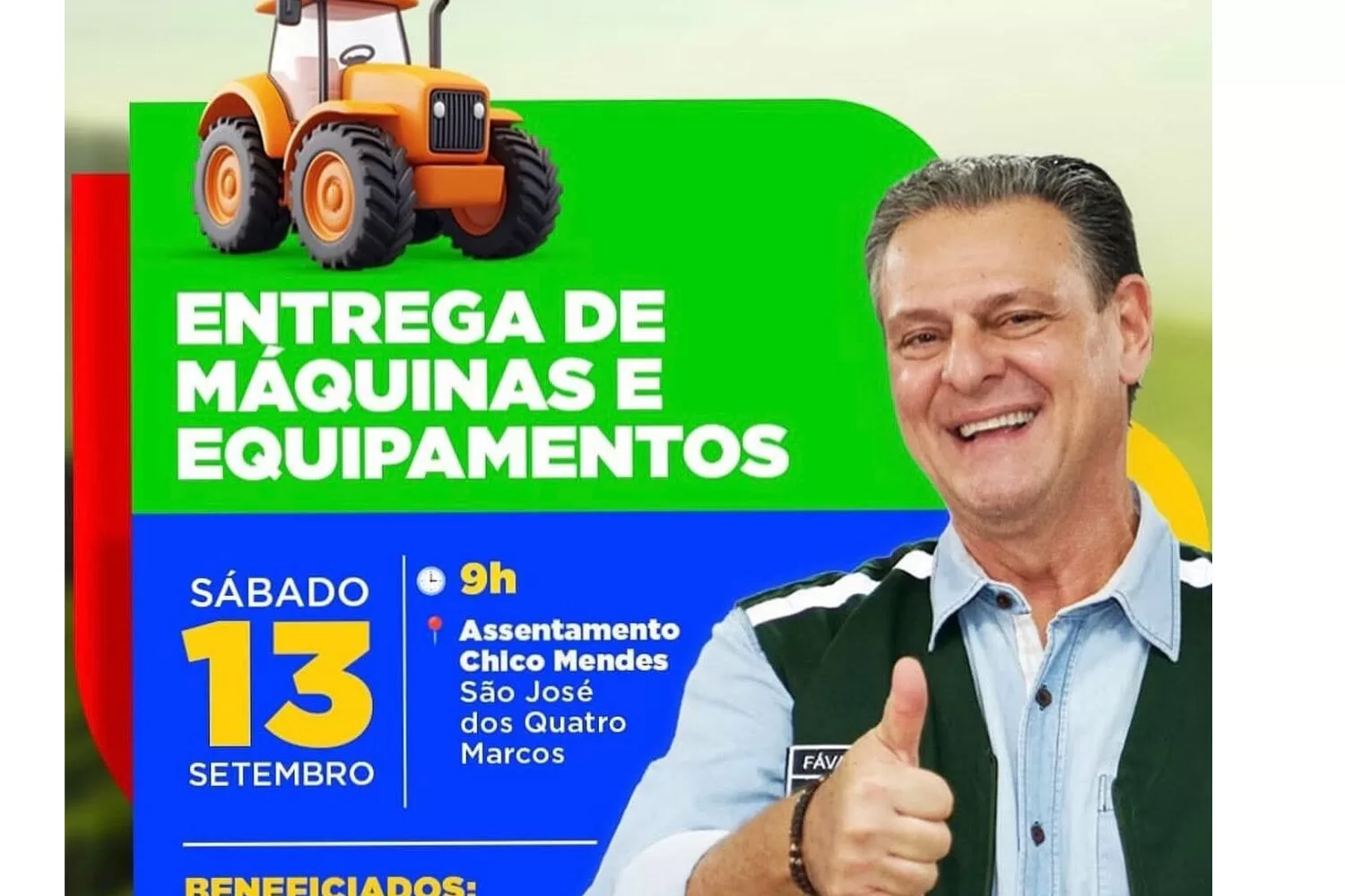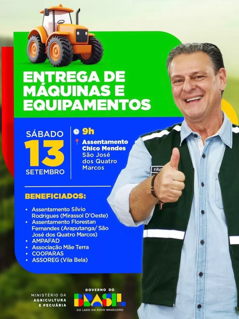 O ministro da Agricultura e Pecuária, Carlos Fávaro, estará no município de São José dos Quatro Marcos, neste sábado (13), para realizar a entrega oficial de um conjunto de máquinas e equipamentos agrícolas destinados a pequenos produtores rurais da região.