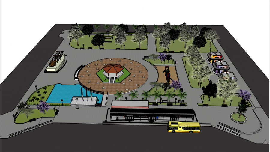 A praça também contará com três quiosques e com uma nova parada de ônibus fechada em vidro com ar condicionado e placas solares. Ainda será construído um playground infantil com piso emborrachado e mantidos os estacionamentos com pavimentação em concreto.