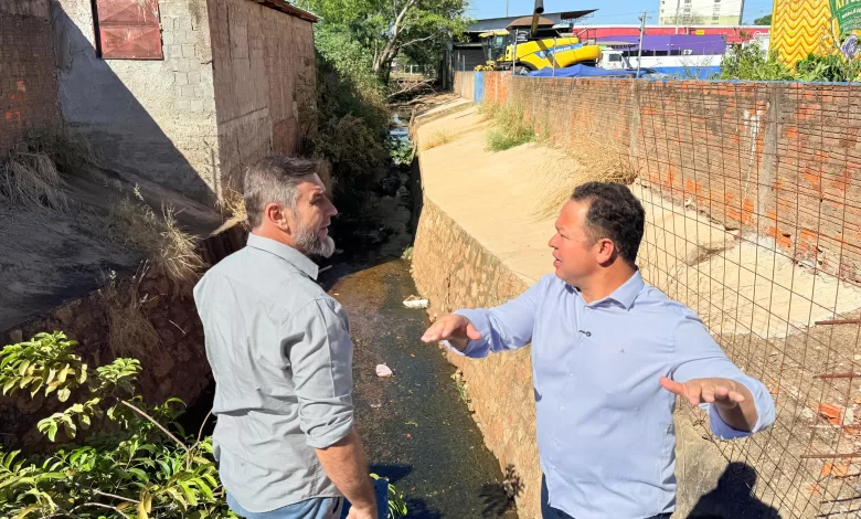 O prefeito Cláudio Ferreira e o presidente da Câmara Municipal, Paulo Schuh, estiveram vistoriando na manhã desta segunda-feira (20) um dos pontos mais críticos em termos de drenagem em Rondonópolis. A pedido de comerciantes, eles analisaram pessoalmente a situação do Córrego do Patrimônio, na região central do município, que historicamente sofre com transbordamentos na época da chuva.