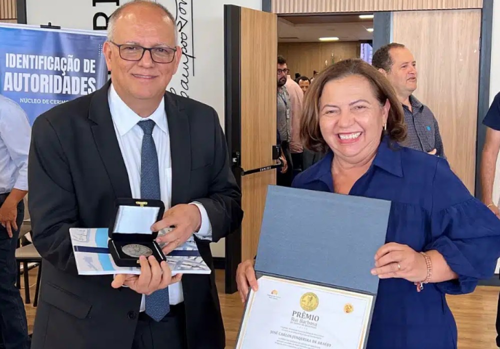 O prefeito José Carlos do Pátio acompanhado pela primeira-dama Neuma de Moraes esteve na manhã desta quarta-feira (18) na capital Cuiabá, no Auditório Conselheiro Lenine de Campos Póvoas, da Escola Superior de Contas do Tribunal de Contas de Mato Grosso (TCE-MT), onde foi homenageado e recebeu duas honrarias, sendo: um Diploma de Honra ao Mérito e a medalha Rui Barbosa de Gestão de Qualidade aos gestores públicos que contribuíram para a efetividade da gestão estratégica do Tribunal de Contas.