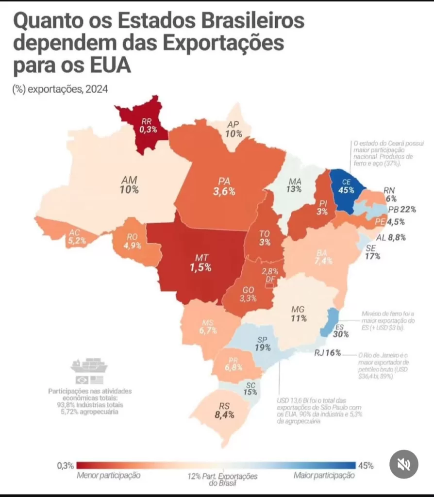 Este cenário de segurança contrasta fortemente com a realidade de outras regiões do Brasil, que serão mais impactadas pela medida. O mesmo estudo aponta que estados como o Ceará enviam 45% de suas exportações para os EUA, majoritariamente produtos de ferro e aço. Outros, como Espírito Santo (30%) e São Paulo (19%), também possuem uma exposição significativamente maior e, portanto, mais vulnerável à nova taxação.